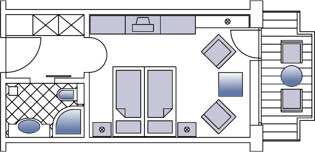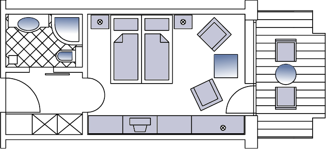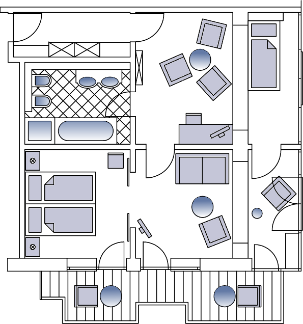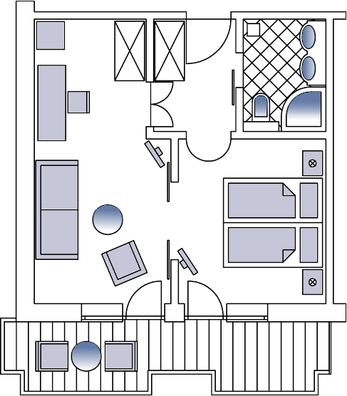 Bright comfortable rooms with furnished balconies or balcony terraces, cosy sitting area, desk, beds adjustable at head and feet, direct dialling telephone, cable TV, radio alarm, minibar, safe, umbrella and cuddly bathrobes.